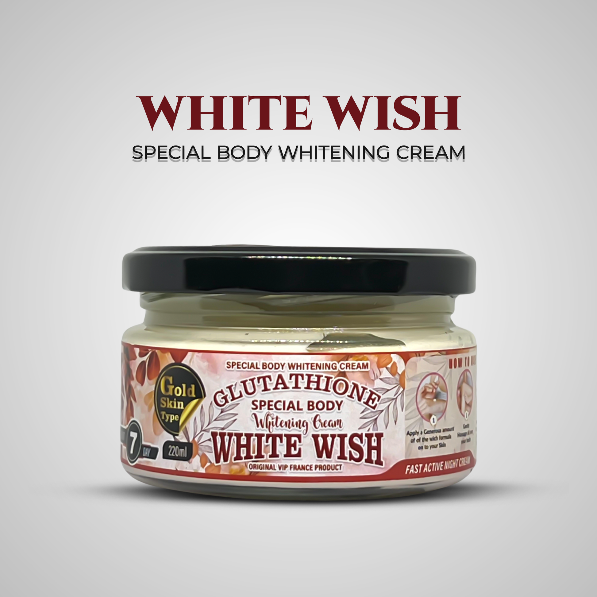 Make your skin glow with White Wish Special Body Whitening Cream. Crafted to lighten dark areas and even out skin tone, this luxurious formula deeply hydrates and enhances your natural radiance giving you visibly brighter, smoother skin with every use.
